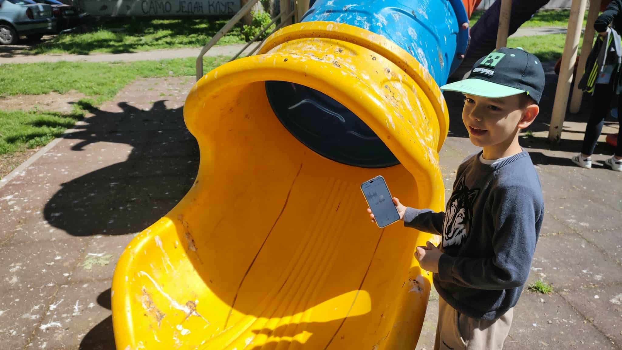 - У оквиру пројекра „Истражи звук“ ишли смо до парка да снимамо звукове из природе. Након што смо снимили вране и мачку пала нам је на памет идеја да снимимо како звучи тобоган када се деца спуштају. Сви су желели да се спуштају низ тобоган, а Дамјан се јавио да покуша да сними звук. Уопште није било лако. Није нам пало на памет да не смемо да се смејемо приликом спуштања низ тобоган, па нам је први снимак уместо звука спуштања деца испао звук смејања. Други покушај био је много успешнији. Деца су се суздржавала да се не смеју, а Дамјан је ставио телеефон убље у тобоган. На крају добили смо оно што нам је требало - звук тобогано који ћемо мешати са другим звуковима које смо снимили.