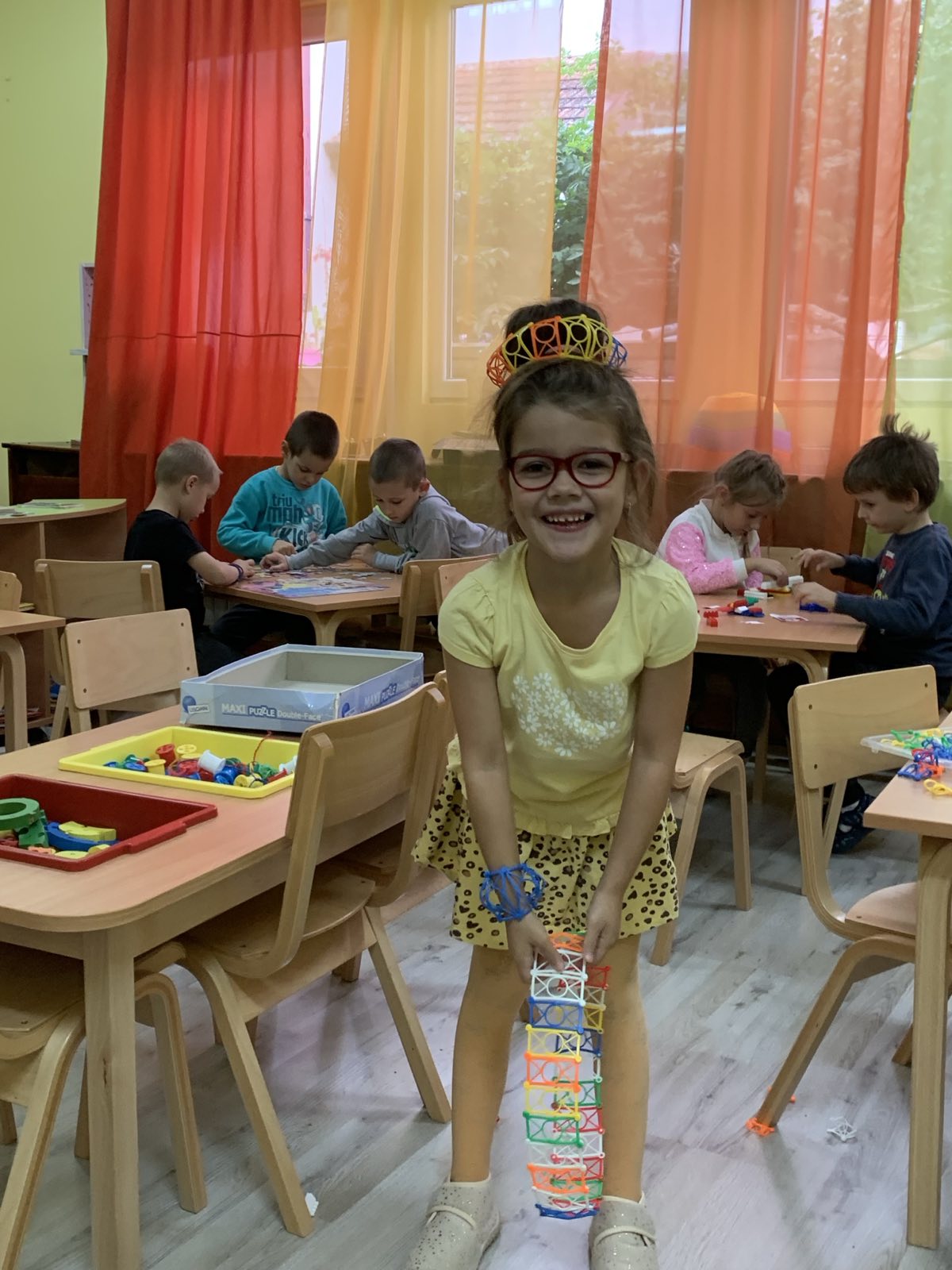 - У просторној целини за конструисање деца обично праве продукте као што су грађевине, зоо-врт, роботе. Вања увек има неку другачију идеју. бира елементе који се слажу, и воли продукт свог рада да осмисли потпуно сама без прихватања туђих идеја. Деца се углавном радознало окупе око ње, и одушеве се кад од материјала који имају она направи нешто сасвим другачије. воли да игра уз музику и смишља кореографије изводећи различите покрете.