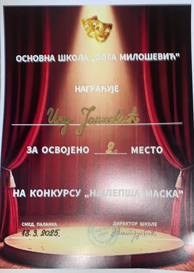 Ученица је учествовала на конкурсу “Најлепша маска“ поводом Светског дана позоришта за децу и младе који смо организовали у нашој школи. Иако је достављен велики број радова, одлуком комисије њена маска је освојила друго место! Били смо јако поносни на њен успех. Он је дошао као награда за труд у свему! Браво, Ина! - Persistence