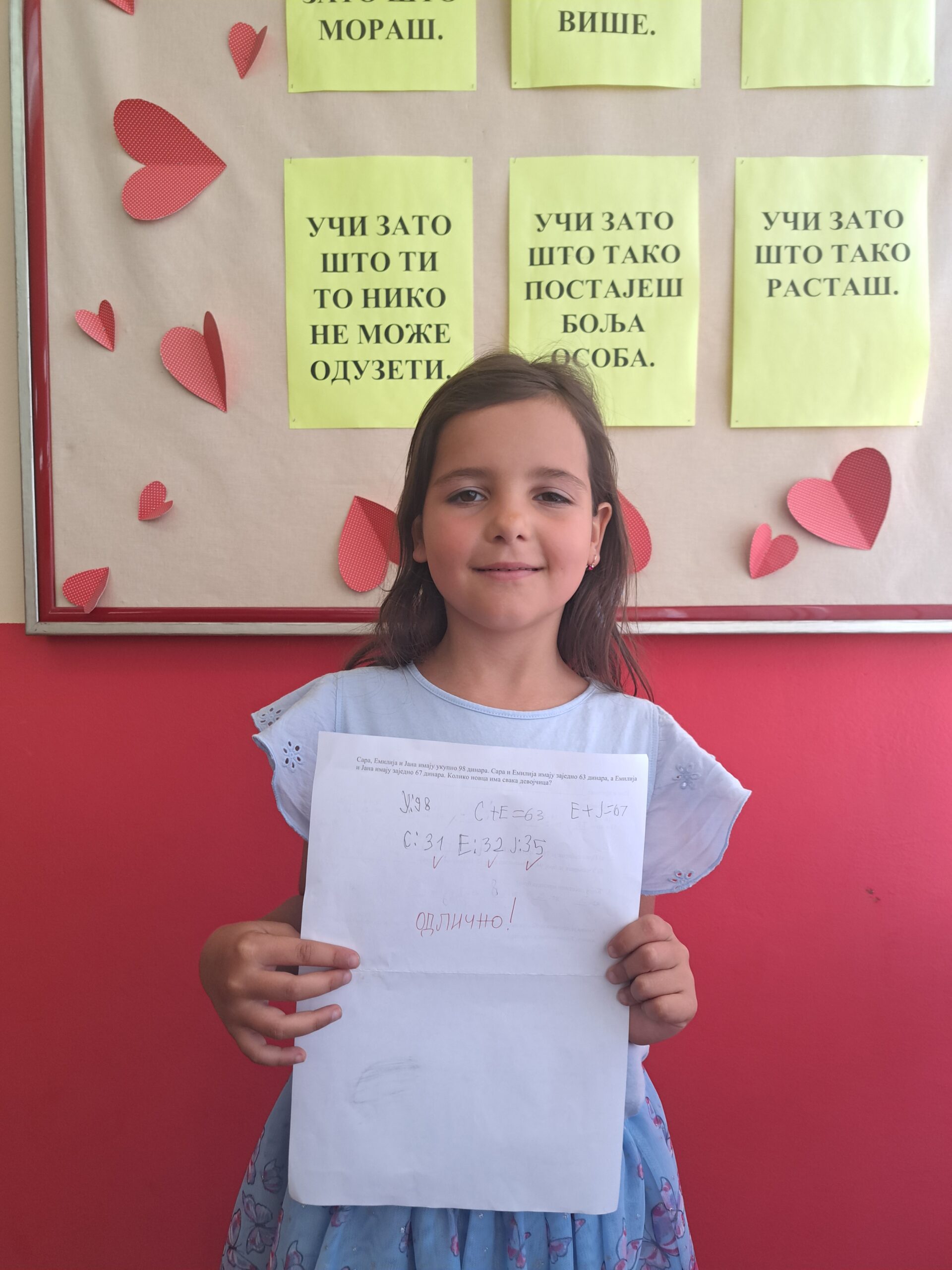 • Маша је ученица која од првог дана у учионицу уноси мир и тишину. Све што ради – ради са пажњом, стрпљењем и великом тачношћу. Њен приступ учењу је јединствен – не жури, не брине, не упоређује се са другима. Само се труди. Нарочито у математици, где многи ученици понекад пожуре и направе грешке, Маша увек прво добро размисли, па тек онда решава.