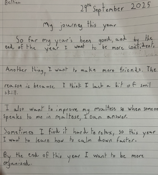 • A story about how students feel about this year, their goals and what they would like to achieve - Bettina showed she can be reflexive, to think about what is to come and how she can tackle it.