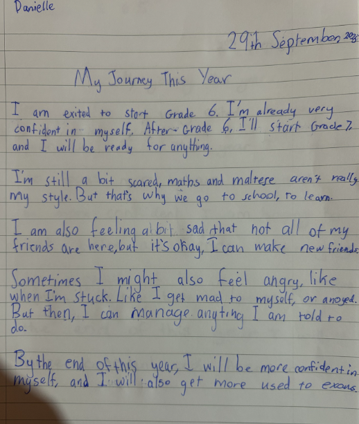 - A story about how students feel about this year, their goals and what they would like to achieve – Danielle showed she can be reflective, thinking about what is to come and how she can tackle it, authentically.