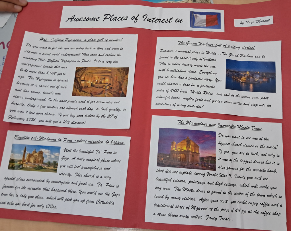 - Fantastic work Faye! Your poster is very creative and it really makes Malta look like an exciting place to visit. I love how you shared interesting ideas that would attract tourists. You clearly put a lot of effort into this - well done, keep up the great work!