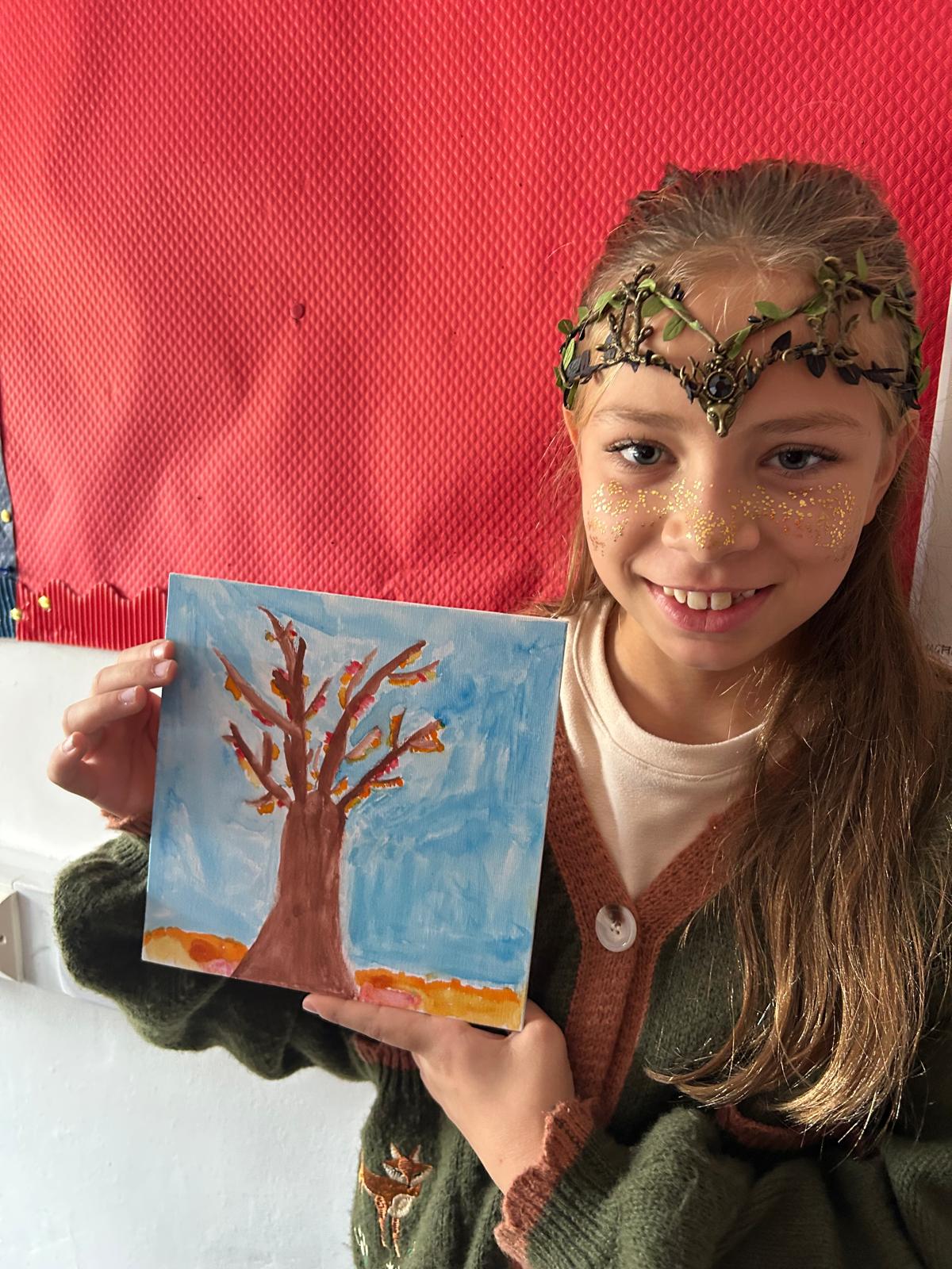 - On Autumn Day, celebrated on the 30th of October, I dedicated the activity to Art in line with the school’s yearly theme. The children were shown different portraits for inspiration and were guided to create their own artwork on canvas while listening to autumn-themed music to set the atmosphere. Nina approached the task with great enthusiasm and passion. She remained fully on task throughout the activity and expressed her ideas confidently through her artwork. I was very impressed by the focus, creativity, and dedication she showed while working. Nina’s passion for art was clearly evident, and she produced a lovely piece of work.
