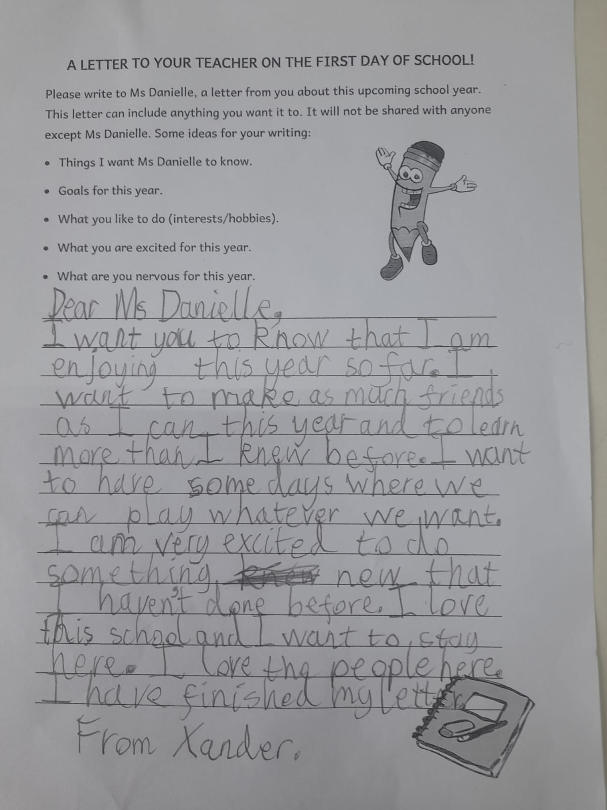 - Xander demonstrates a positive personal and social identity by confidently expressing a developing sense of belonging as a new student, valuing friendships, and sharing feelings and goals for the school year.