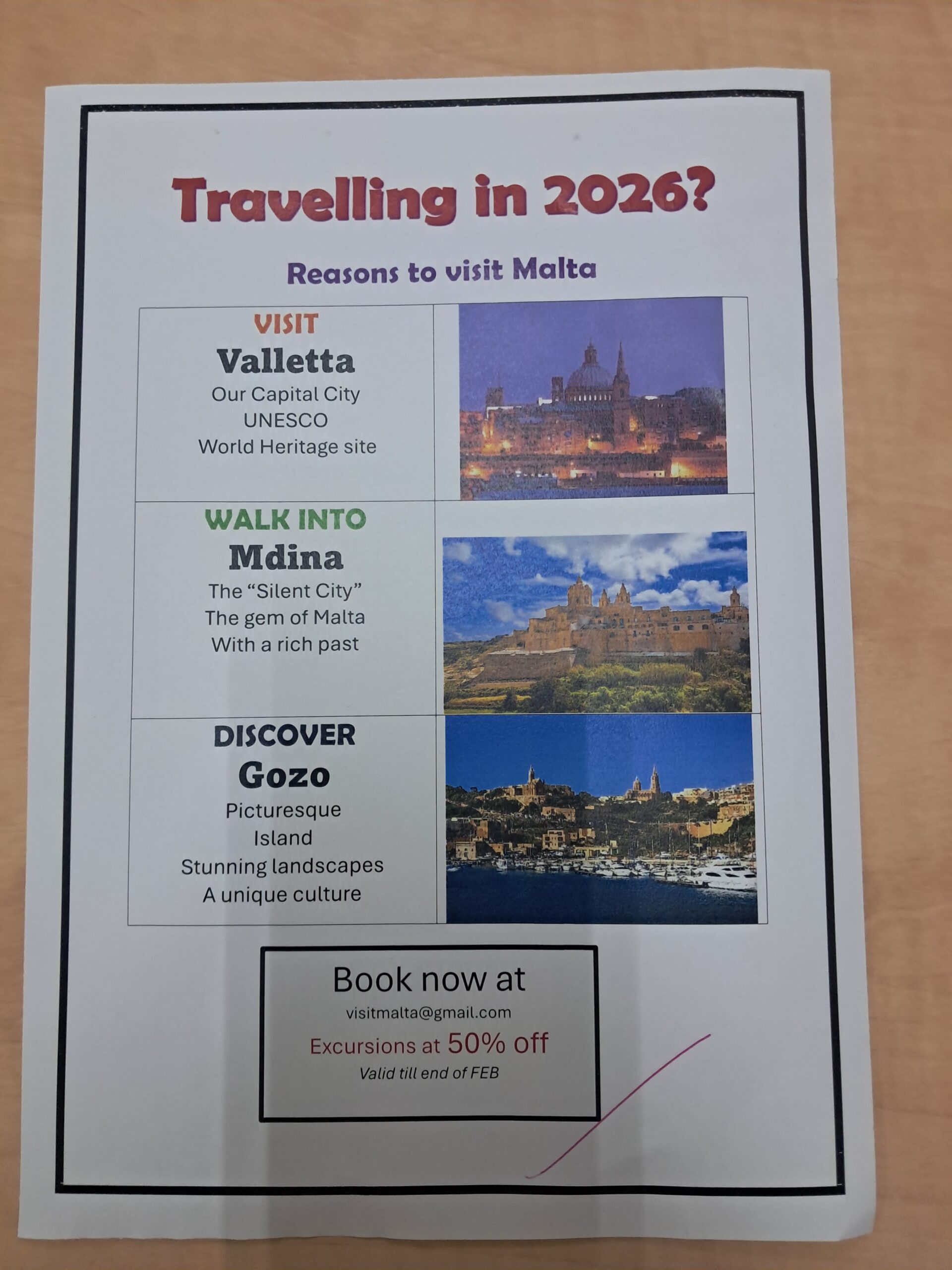 - Great job on your poster encouraging tourists to visit Malta! You did an excellent job including pictures, offers, and useful information about the beautiful places in Malta. It’s clear that you put a lot of thought and creativity into it. Keep up the fantastic work!