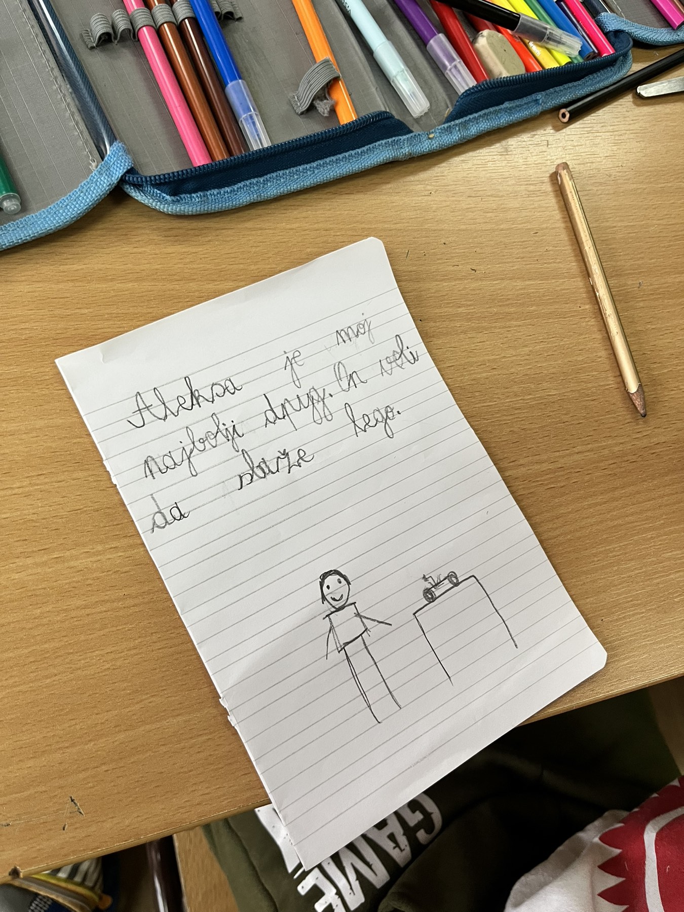 - Похваљиваћу Алексу када показује стрпљење и отвореност у договорима са друговима, посебно током заједничких активности и игара. Подстицаћу га да настави да пажљиво слуша друге и да предлаже решења која доприносе сарадњи и добрим односима у одељењу. Охрабриваћу га да и даље буде пример фер и културне комуникације међу вршњацима.
