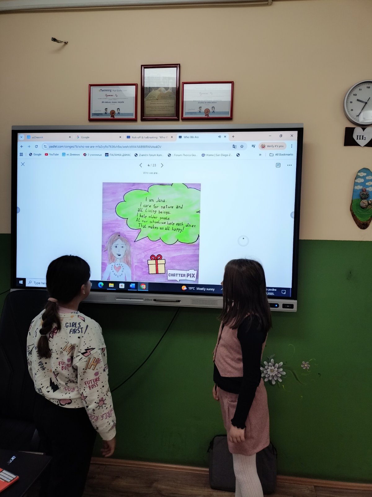 • Прихватила сам позив колега са Кипра, из Грчке и Румуније да се прикључим eTwinning пројекту „Заједно бринемо: Вештине за живот кроз волонтирање“ који ће трајати од октобра до априла са жељом да својим ђацима понудим разноврсне, креативне, другачије начине учења и дружења. Овај пројекат има за циљ да подстакне активно грађанство и животне вештине код младих ученика кроз смислена волонтерска искуства. Ученици узраста од 6 до 12 година учествоваће у заједничким активностима усмереним на бригу о животној средини, заштиту животиња и подршку старијима. Кроз учење засновано на пројектима, дигиталне алате и међукултурну размену, деца ће развијати емпатију, тимски рад и одговорност – вештине неопходне за живот. Са ученицима се реализују активности као што су: упознавање и културна размена, еколошке акције чишћења и еко-кампање, приче и постери о заштити животиња, интервјуи са старијима и виртуелни догађаји, израда заједничке е-књиге која приказује ток пројекта -„Заједно бринемо: Наше волонтерско путовање“. На моје велико изненађење само две ученице су пожелеле да учествују у пројекту. Једна од њих је била Јана. И тако је почела једна узбудљива авантура у којој је веома лако и лепо реализовати и постизати задатке који су пројектом предвиђени. Јана постаје прави истраживач, поготово када је са својом другарицом Леном. Одмерена, одговорна, креативна, због радозналости постаје одважна упркос треми са којом се често бори. Браво, Јано! Пресрећна сам што наш мали тим сјајно функционише и што видим колико уживаш у изазовима које ти кроз пројекат постављам. Само тако настави!
