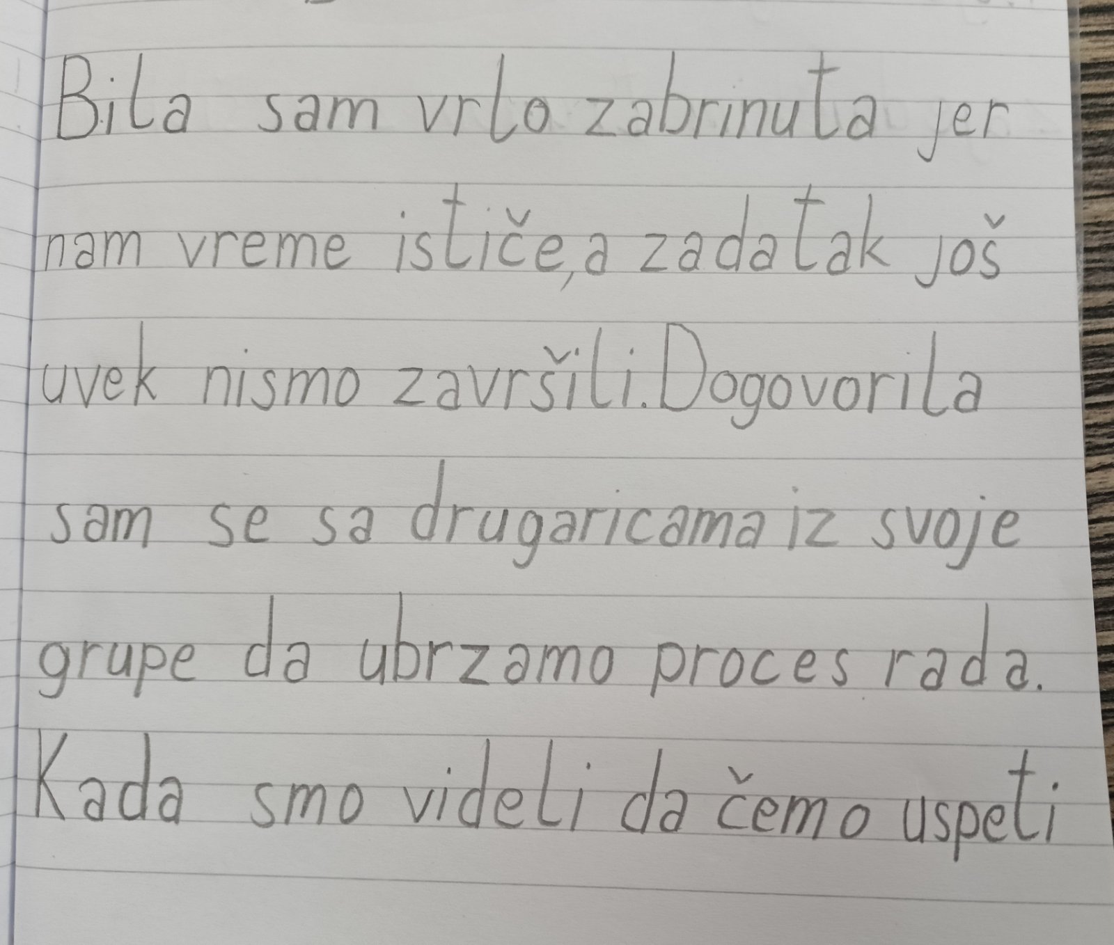 Нађа је мотивисана, вредна, одговорна, посвећена и веома успешна у свим наставним и ваннаставним активностима. То јој не представља проблем, али као и свако дете жели да се опусти и забави. Тада је обично треба подстицати да нешто настави. Овог пута је она подстицала друге на рад, додељујући им улоге у групи.