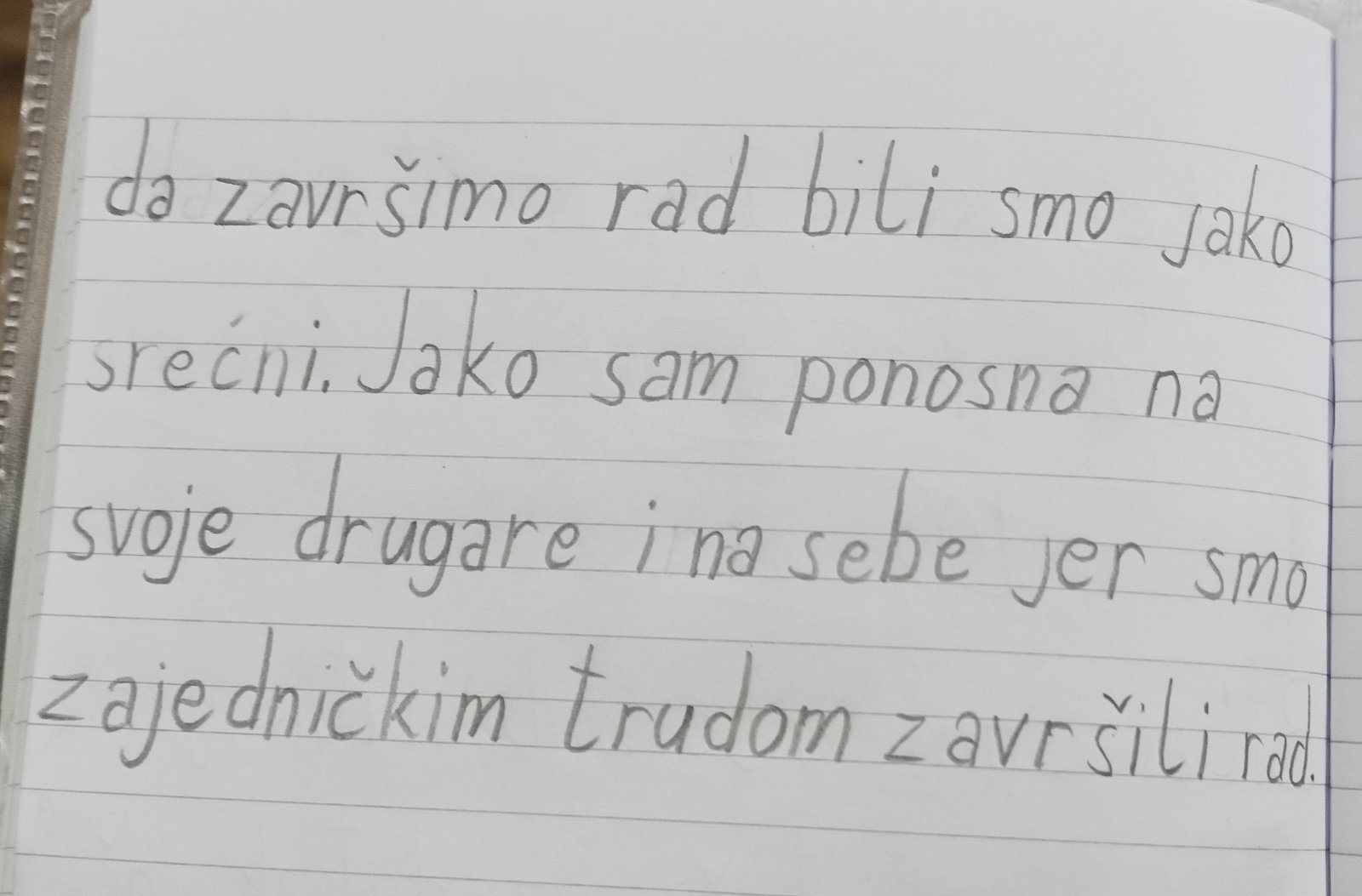 - Ученицу сам подржала да покаже још више иницијативе и рефлексивности у комуникацији са друговима и заједничком осмишљавању пројеката, реализацији идеја, како би допринела свеопштем добру одељења и даље развијала позитиван лични и социјални идентитет.