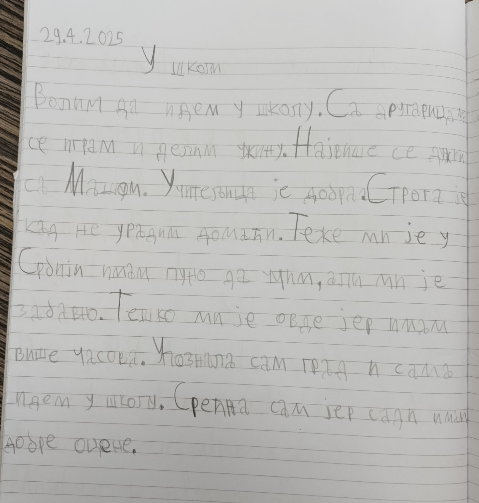 "Волим да идем у школу. Са другарицама се играм и делим ужину. Највише се дружим са Машом. Учитељица је добра. Строга је кад не урадим домаћи. Теже ми је у Србији, имам пуно да учим, али ми је забавно. Тешко ми је овде јер имам више часова. Упознала сам град и сама идем у школу. Срећна сам јер сада имам добре оцене." Коментари другова: