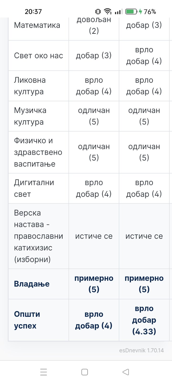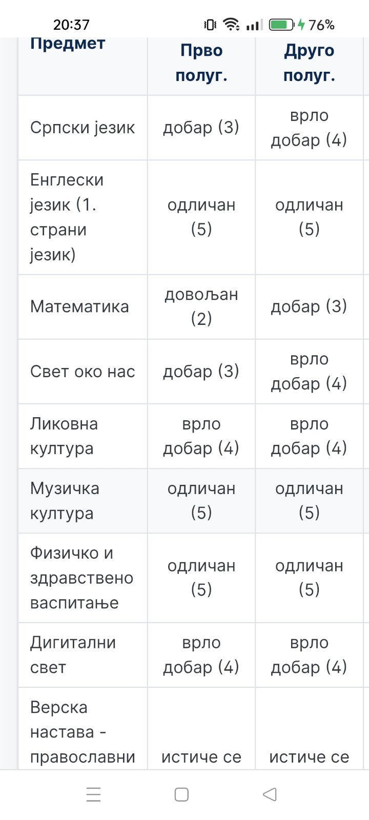 - Лара је уложила велики труд и рад у савдавање наставних садржаја, јер је ове године дошла из Немачке у Србију. Недовољно познавање српског језика је било још једна баријера. Сада, на крају другог разреда уочавамо да је њена отвореност, мотивисаност, одговорност, посвећеност у раду на редовним часовима, допунској настави, раду код куће довела до значајних промена и допринела успешности у свим наставним активностима.