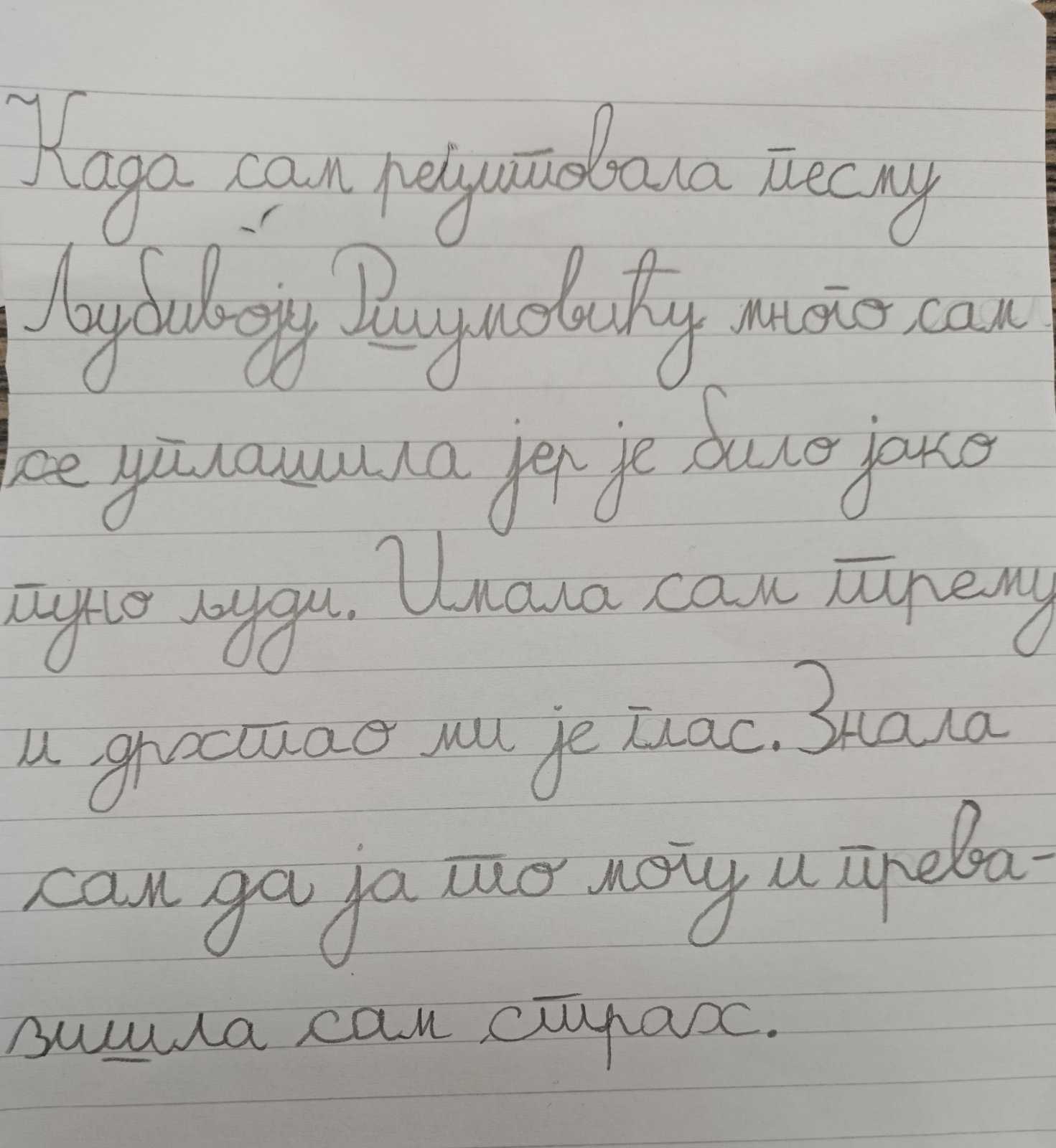 Изборила се са тремом и одлично изнела песму на радост свих. Била сам поносна на њу. https://youtube.com/shorts/ZuhJSFeDCKU?si=nVnbb3dCgGPkaQVW - Отпорност