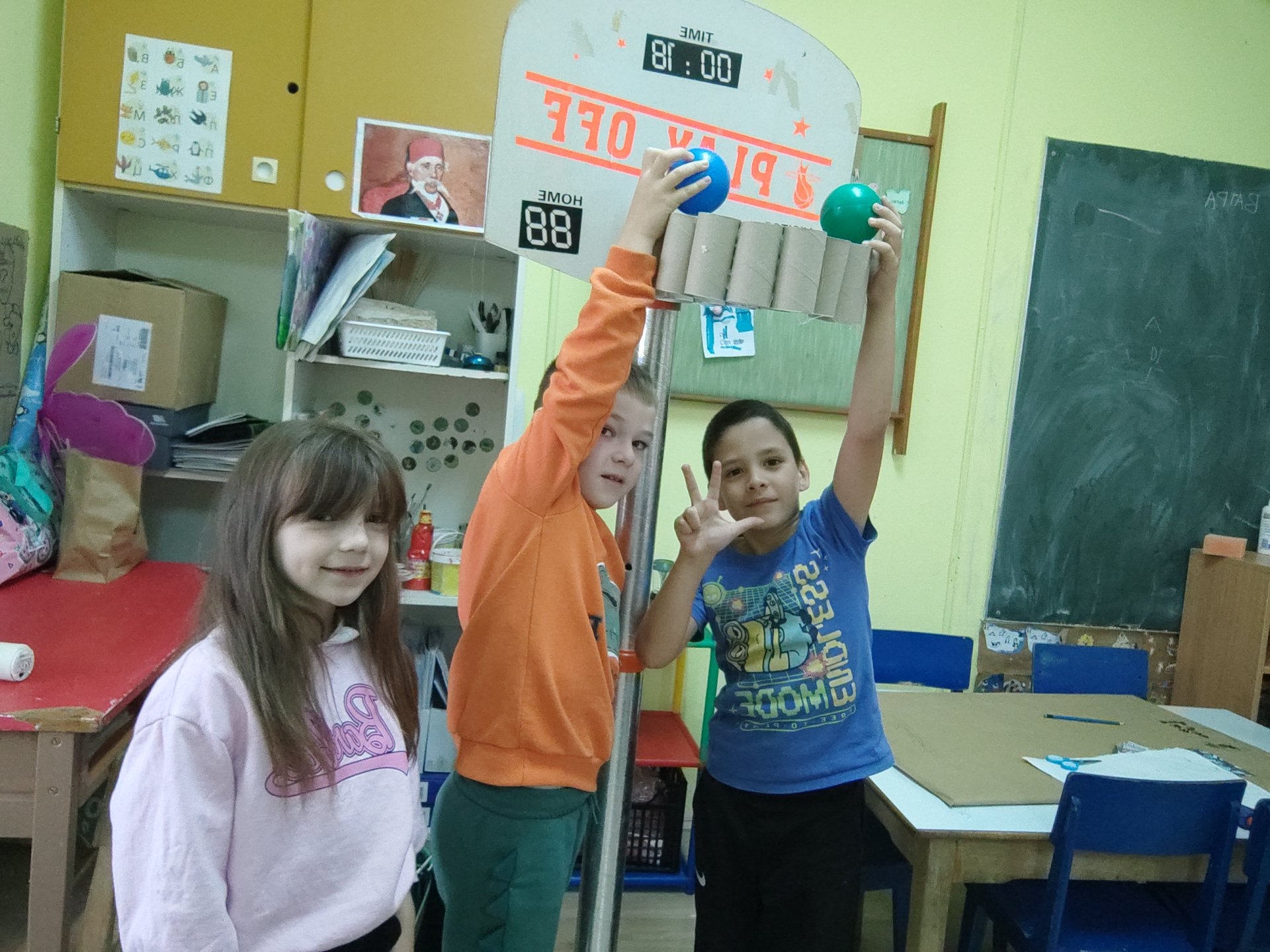 Хтели смо да направимо кош од ролница. Тога се Дамјан сетио, па сам ја смилио како да их поређамо да буде као обруч. Само хоп, хоп,хоп и готово. Нарцртао сам на табли како треба.