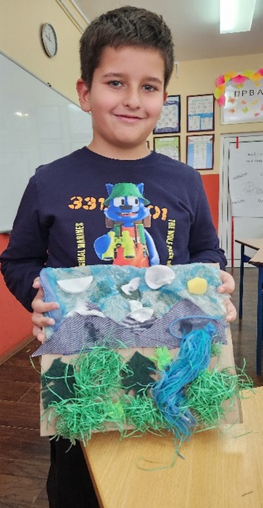 ,,Учитељице ја сам завршио свој рад из ликовног. Понео сам пуно различитог материјала за рад. Представио сам природу, планине, шуму, ливаде и реку која извире на планини. Ови туфери су облаци изнад планина“. – Андреј Г.