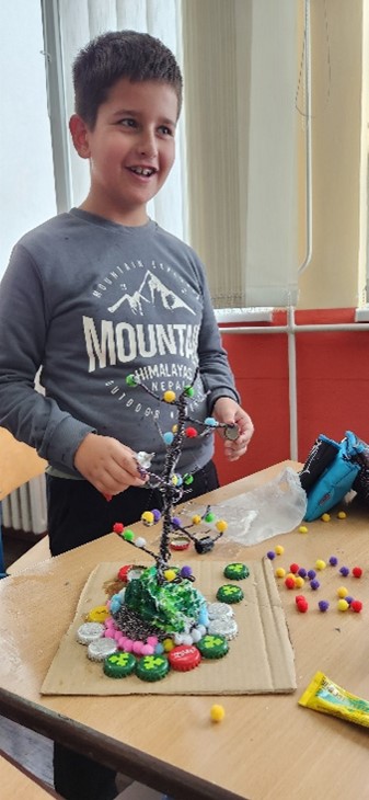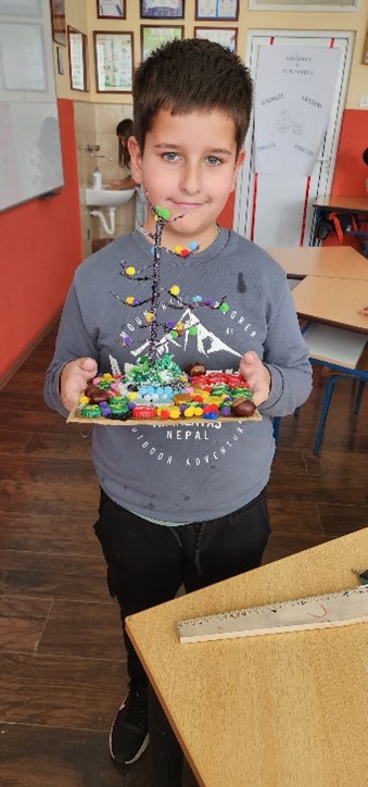 Андре је донео доста материјала за рад. Код куће је размислио, направио план и донео потребна средства за своју креацију. Креативан је, стрпљив и уредан у раду. Два часа је уживао. Видело се да му прија и да је задовољан оним што је направио. На крају часа је показао рад и са нама поделио своју срећу.