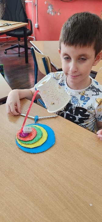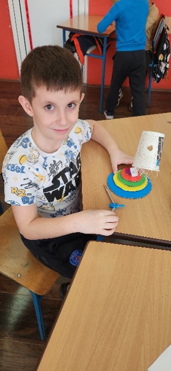 Вукашин је донео доста материјала за рад. Код куће је размислио, направио план и донео потребна средства за своју креацију. Креативан је, стрпљив и уредан у раду. Повезује знања и вештине стечене на другим часовима. Два часа је уживао. Видело се да му прија и да је задовољан оним што је направио. На крају часа је показао рад и са нама поделио своју срећу.