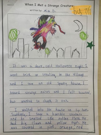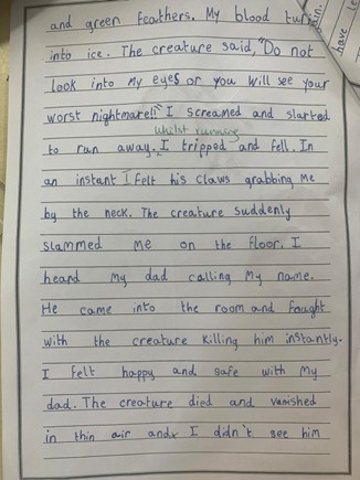 • Well done Mia for such a great writing task!! You are very creative and your curiosity to find out more about your strange creature developed into a great piece of writing. Well done!