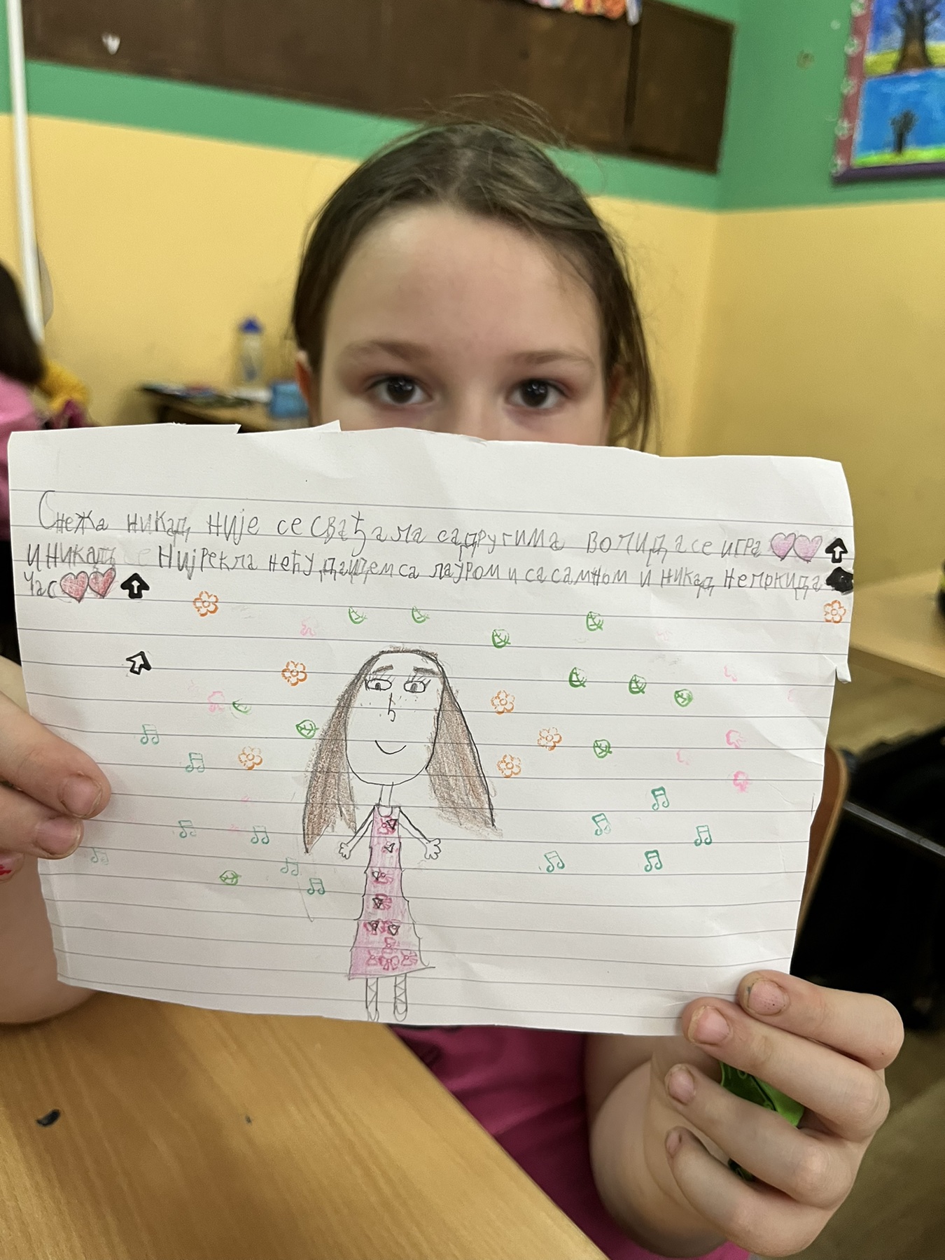 - Похваљиваћу Снежану када показује стрпљење и отвореност у разговору са другарицама. Подстицаћу је да и даље примењује вештину пажљивог слушања у свакодневним ситуацијама, посебно током одмора и у неформалним договорима. Охрабриваћу је да настави да буде позитиван пример лепе комуникације и разумевања међу вршњацима