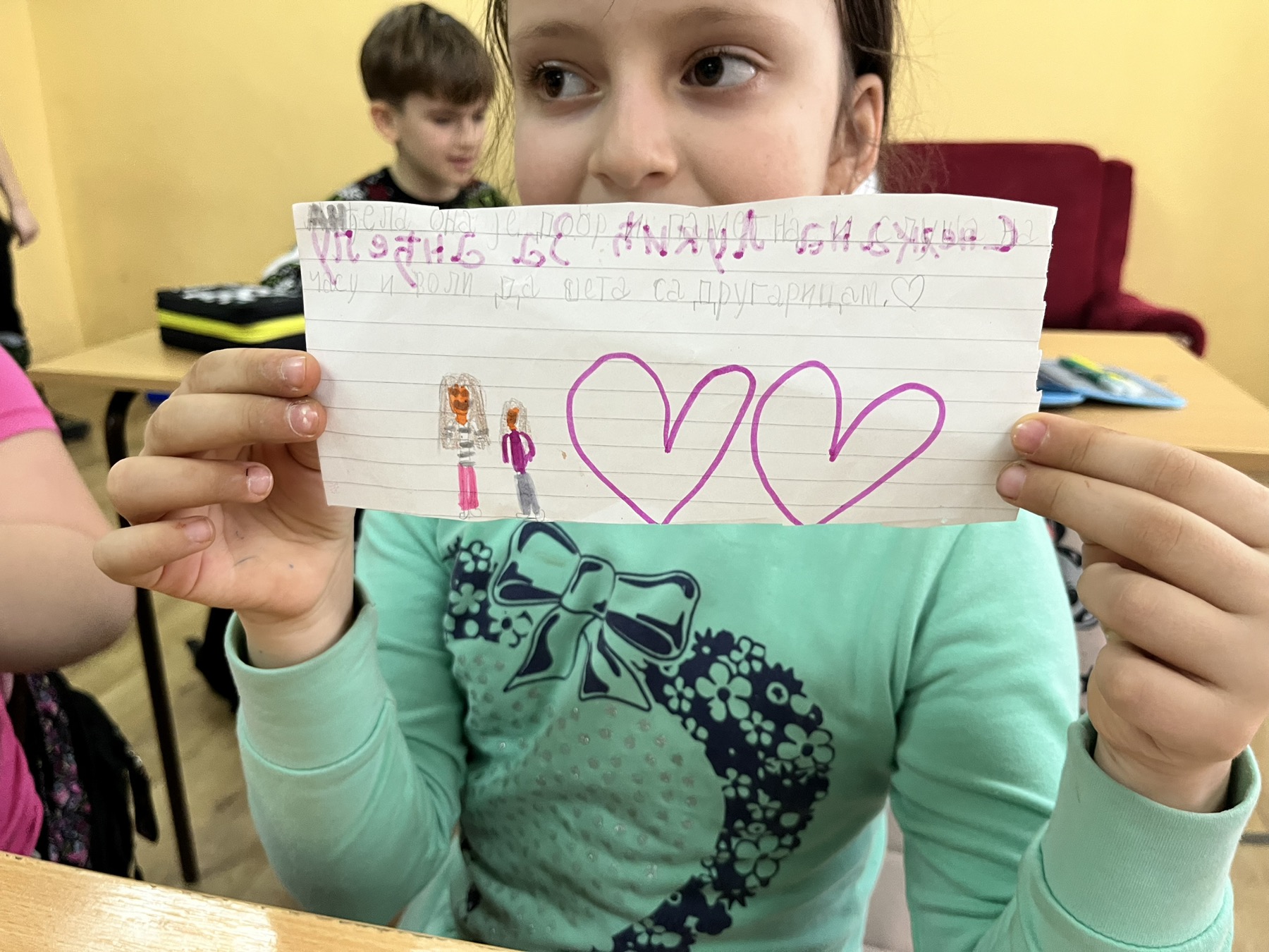 • На свим часовима редовне наставе, као и на часовима ваннаставних активности, Анђела стрпљиво и пажљиво слуша своје другаре док излажу своје одговоре. Док другови износе своја мишљења, Анђела их пажљиво слуша, не прекида их увек реагује на оно што говоре. Када добије реч, надовезује се на оно што су други рекли и својим коментаром доприноси да разговор буде смирен и садржајан. Захваљујући њеном пажљивом слушању, ученици се увек осећају саслушано.